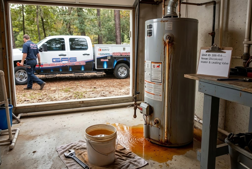 Any sign of water pooling around your gas water heater is a red flag. Even small leaks can indicate internal tank corrosion, loose connections, or failing valves.